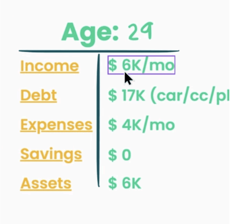 He’s 29 — dangerously close to that “dirty 30”— and earns $6,000 per month. Yet he’s saddled with $17,000 in debt and has $0 in savings. According to Fidelity, he is financially behind. I agree, BUT…he has plenty of time to get back on the main quest (for my non-gamer friends, this means “get back on track”).