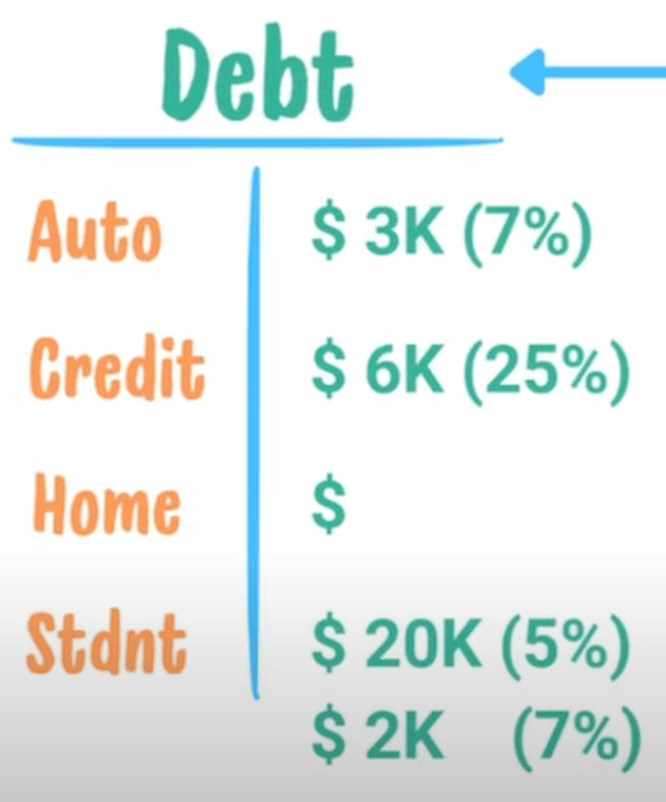 Since her high interest rate debt will outweigh potential investment gains, the focus should be on the credit card (25%) first. Using the avalanche method, she'll pay down her debt by making large extra monthly payments and be debt-free in 9 months for $680 interest 💪